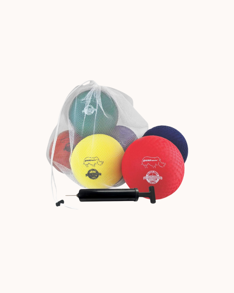 - DURABLE: Coated with patented rhino skin, these 7 inch balls are tear resistant to withstand rough play and regular outdoor use at school or at home with the family; comes with mesh carrying storage bag and hand, ball pump with in-handle pump needle
