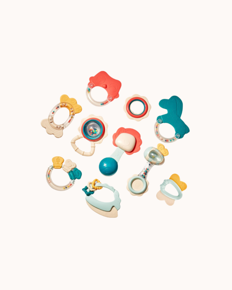 - Several Sounds and Colors: This 10-piece rattle set provides a diverse range of sounds that help babies develop auditory awareness. As babies learn to associate the sound of a rattle with movement, they’ll begin to turn their heads toward the noise. The set also allows babies to produce fun sounds as they shake the toys, encouraging their hand-eye coordination and visual tracking skills. Additionally, each rattle features bright colors with high contrast that promote vision development