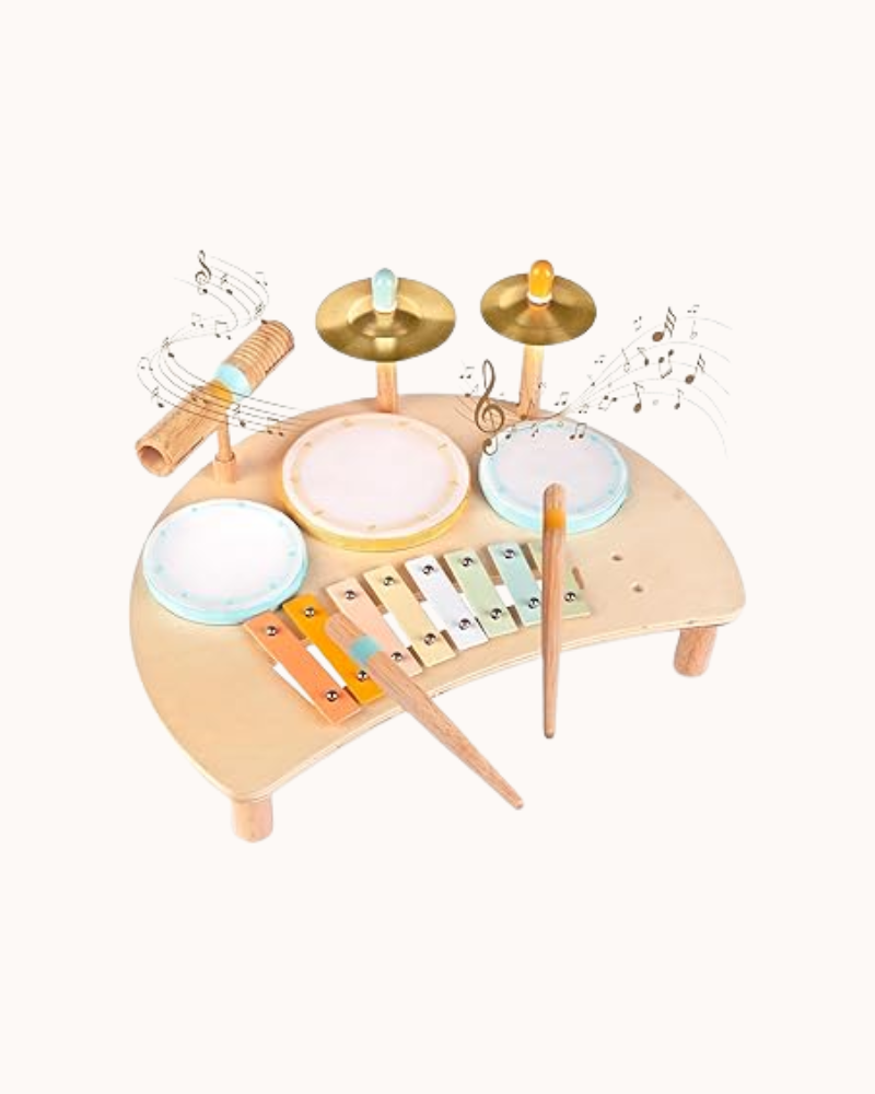• Neutral Colors Wooden Baby Toys:All the materials and colors of our montessori toys come from nature.These montessori wooden toys can keep baby focused and calm,improving children’s concentration. An all-in-one musical instrument featuring 3 drums, 2 drumsticks, 2 cymbals, a sound block and a xylophone. Have 4 stable legs, allowing children to easily play tunes or tap rhythms.